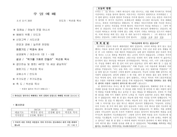20240818 교회 주보 페이지 정보 작성자 늘푸른교회 댓글 0건 조회 1,527회 작성일 24-08-18 19:59 목록 본문 교회 주보 이전글20240825 교회 주보 24.08.27 다음글20240811 교회 주보 24.08.10 댓글 0 댓글목록 등록된 댓글이 없습니다. 목록